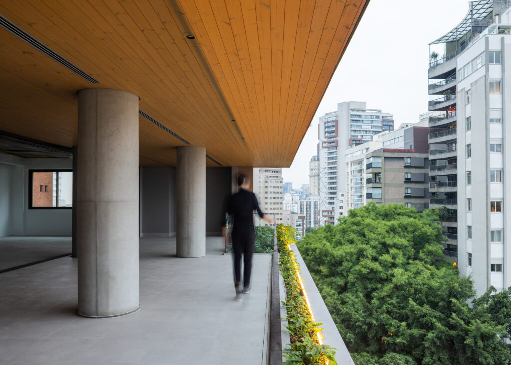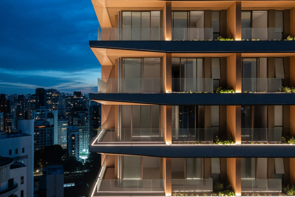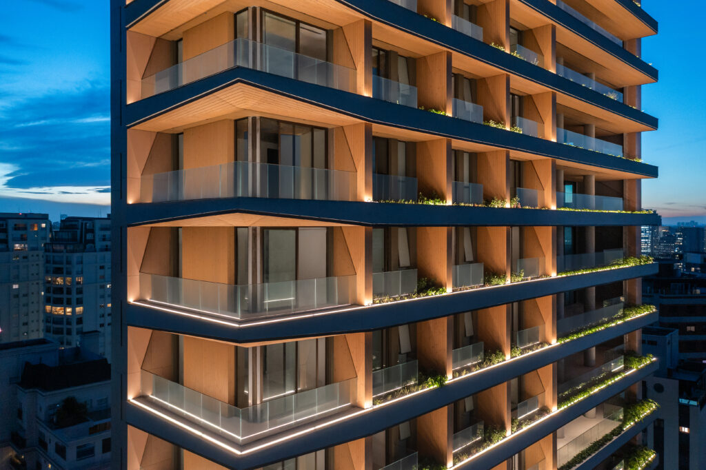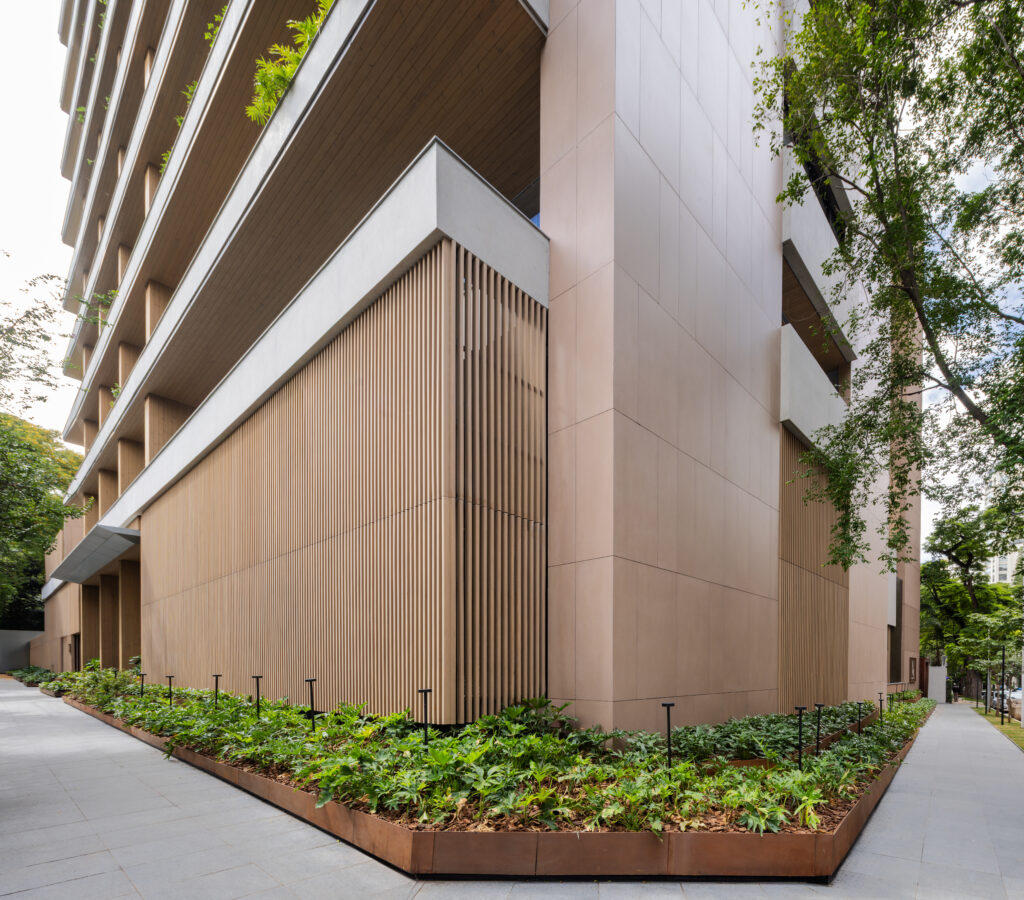 A fachada revela isso imediatamente: concreto aparente, vegetação contínua nas varandas e madeira aplicada como elemento arquitetônico real, não apenas decorativo. O uso da madeira externa em um edifício desta escala ainda é raro no Brasil, especialmente em fachadas ventiladas de alto desempenho.