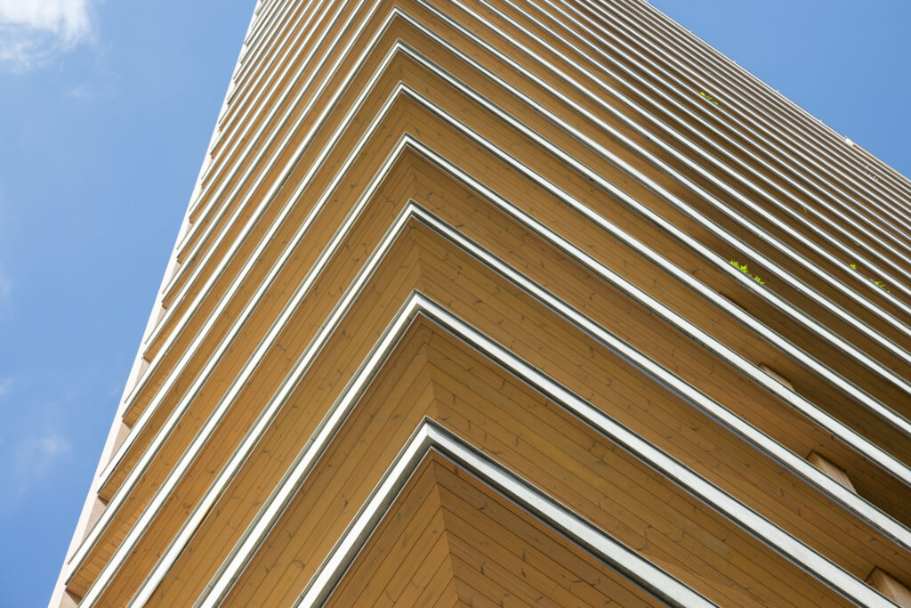 Nesse projeto, a escolha foi pela madeira finlandesa da Lunawood, aplicada com acabamento colorido executado em obra — uma decisão técnica e estética que amplia a leitura tátil do edifício. A madeira termotratada oferece estabilidade dimensional, resistência climática e baixa manutenção, características fundamentais para uso externo em fachadas sofisticadas.